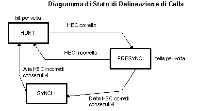 Nello stato HUNT viene ricercata la prima cella col campo HEC corretto, e quindi avviene una transizione allo stato PRESYNC. Al ricevere di celle col campo HEC scorretto, queste vengono scartate e si rimane nello stato HUNT.