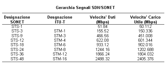 SDH definisce una gerarchia di velocita' standard di trasmissione digitale. La piu' bassa e' denominata STM-1 ed e' di 155.52 Mbps. Piu' segnali SDM-1 possono essere combinati a formare un segnale STN-N ove N esprime il fattore moltiplicativo di velocita'. La notazione corrispondente SONET parte da una velocita' base etta STS-1 di 51.84 Mbps. Vi e' una corrispondenza tra STS-3 ed STM-1.
