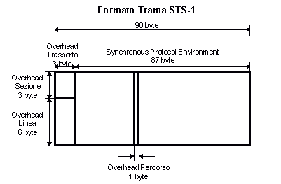 La trama di base per una linea STS-1 SONET consiste di 810 byte trasmessi ogni 125 s con una velocita' dati di 51.84 Mbps. La trama e' suddivisa in 9 righe di 90 byte l'una, trasmesse consecutivamente.