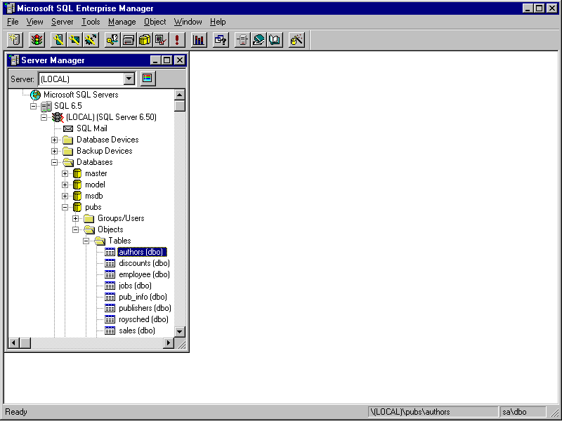 The Explorer view of SQL Enterprise Manager, with the authors table selected from the pubs database.