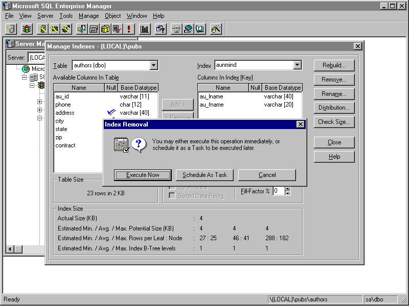 The Index Removal message box confirms whether you want the index removed immediately or scheduled as a task.