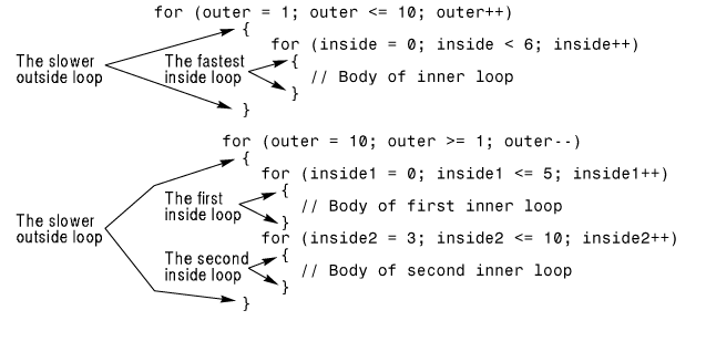 Figure 12.1 shows how you can picture inside and outside loops. The nested loop at the bottom actually contains two separate for loops nested inside an outer loop. Both of the two nested loops completely finish their respective iterations before the