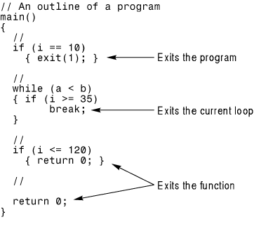 In DOS programs, there is another function you can call, exit(), which immediately stops the program wherever it is. (You need to include STDLIB.H to use exit(). return and break are C++ commands that do not need headers). Figure 12.2 shows the actions of return, exit(), and break.