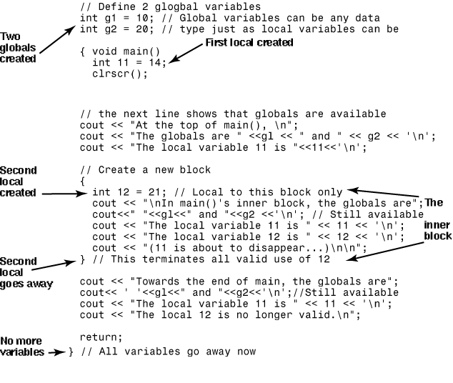 19: cout << "Before leaving main(), i and c are "