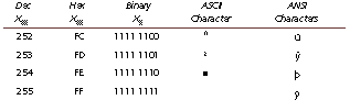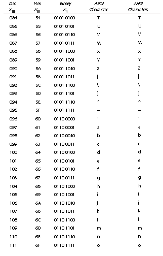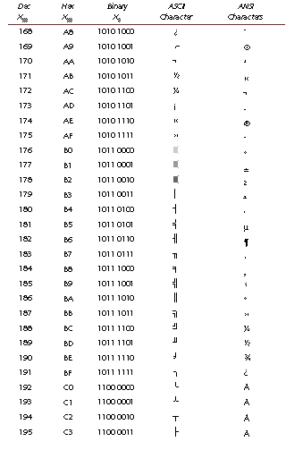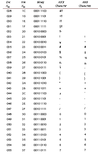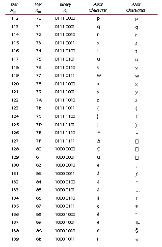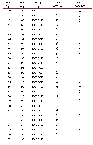 This appendix cross-references the characters represented by ASCII and ANSI code. To convert a code into a character, use Chr(code); to convert a character into a code, use Asc(char). ANSI codes lower than 20 should not be used in a Web