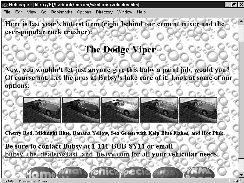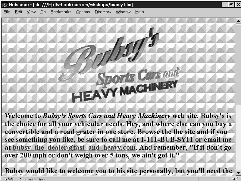 I was in Bubsy's showroom the other day examining his new line of convertible dump trucks when talk turned to the Web. Bubsy was anxious to establish a Web presence for his business and asked if I could help. I accepted the challenge, and the results of Bubsy's Sport Car and Heavy Machinery Web site follow.