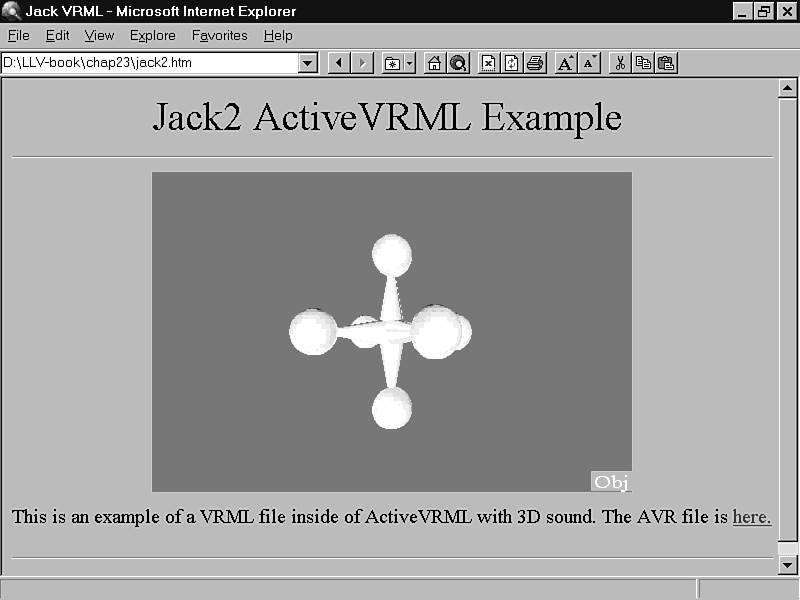 When ActiveVRML detects a VRML scene, it automatically presents some navigation options. As you move the cursor around the screen, it changes to an arrow. Clicking and dragging the button moves the scene in the direction of the arrow. When the cursor is in the center of the screen, it changes to crosshairs. By clicking on these crosshairs, you can rotate the object around.