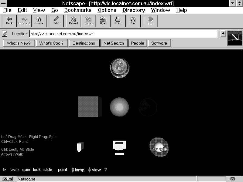 When you're first learning to get around, stick with just one navigation method. VRML browsers offer at least two different ways of exploring the world, and many offer more. Until you're familiar with one, it's wise not to chop and change. Changing is one of the quickest ways to get disoriented. There is quite a difference between being lost and being disoriented in VR worlds. Being lost means that you have absolutely no idea about where you are; being disoriented means you can't work out which way is up, or worse still, have no idea how to adjust your view so that you could work out where you are.