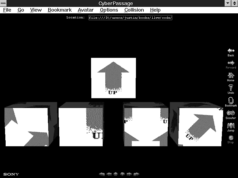 To illustrate a few points, the simple picture of the arrow on a couple of faces works better than a real-world object having a few hundred faces. Most of the applying textures to individual faces will eventually be done in a proper GUI VRML editor, rather than being done by hand. However, if you know the principles behind it, then you can create some wonderful worlds very quickly.