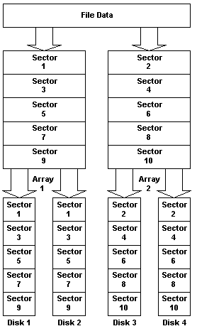 A diagram of RAID 0 (Sector Striping) with two drives.