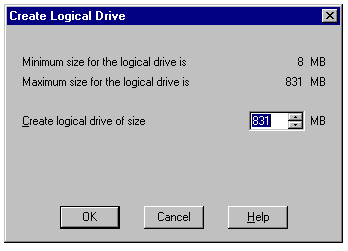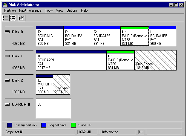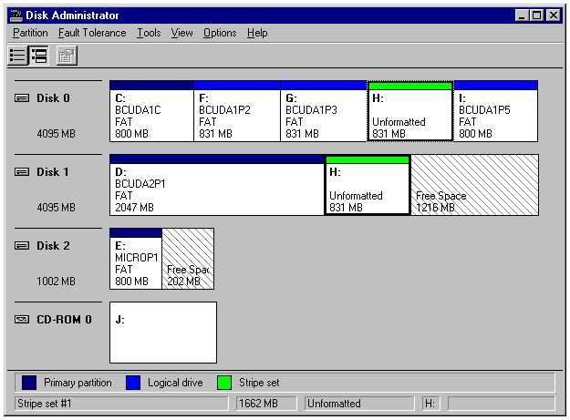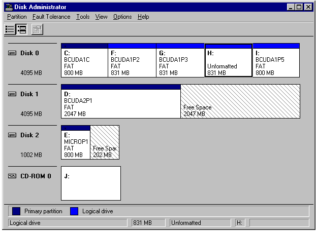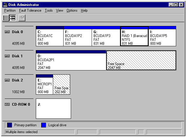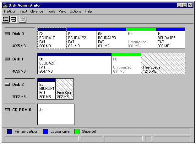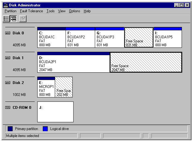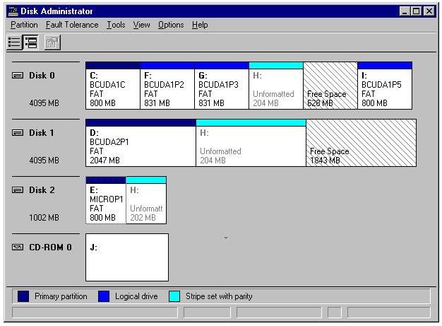 The computer used in the following example is OAKLEAF3, a 133MHz Pentium server that dual boots Windows 95 for digital video editing and Windows NT Server 4.0 for network test purposes. OAKLEAF3 is equipped with two Seagate ST15150W 4.3G Barracuda Wide SCSI drives (Bcuda1, Disk 0, and Bcuda2, Disk 1); a 1G Micropolis narrow SCSI drive (Microp1, Disk 2); and a Toshiba 4X SCSI CD-ROM drive connected to an Adaptec AHA-2940UW host controller. Bcuda1 has five 800K FAT partitions (Bcuda1p1 through Bcuda1p5), and Bcuda2 has two 4G FAT partitions (Bcuda2p1 and Bcuda2p2). Microp1 is divided into 800K (Microp1p1) and 200K (Microp1p2) partitions. The Bcuda1p4, Bcuda2p2, and Microp1p2 partitions were deleted (converted to free space) before performing the steps described in the following sections.