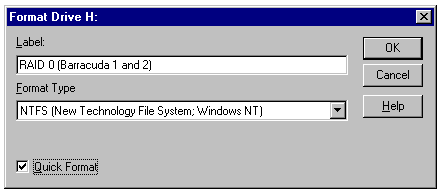 As recommended in the preceding section on RAID 0 stripe sets, don't use Quick Format if you haven't previously formatted the free space used for the new volume. A full format tests for bad sectors during the formatting process and marks bad sectors unusable in the drive's sector map.