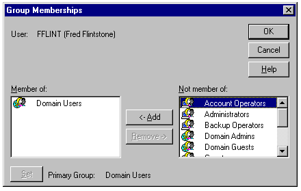 In the Group Memberships dialog, the setting for the user account's primary group applies only to users accessing a Windows NT network through Services for Macintosh. To set the primary group, select a group from the Member Of list and click the Set button.
