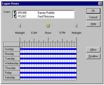 If the option Forcibly Disconnect Remote Users from Server When Logon Hours Expire is selected in the Account Policy dialog, remote users whose logon hours expire are prompted to disconnect from the network. If users don't log off, the server will disconnect them automatically.