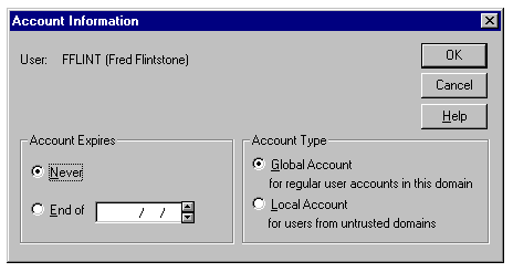 Maximum Password Age determines how long account passwords are in effect before they expire. The options are Password Never Expires or Expires In n Days (the default). Minimum Password Age determines how long a user account is forced to retain a new password. The objective is to prevent users from entering a dummy password when their password expires and then immediately changing it back to the old password. The options available are Allow Changes Immediately (the default) or Allow Changes In n Days. Minimum Password Length determines the minimum allowable length for all passwords. The options available are Permit Blank Password (the default) or At Least n Characters. To maintain a secure network, require passwords of at least six (preferably at least eight) characters. Password Uniqueness tells Windows NT Server whether to keep a history of previously used passwords. The objective is to prevent users from reusing the same password when a password expires. The available options are Do Not Keep Password History (the default) or Remember n Passwords. For maximum security, set n to 8 or greater.