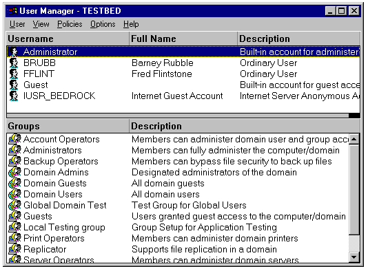 User Manager lets domain administrators create, modify, and delete groups; assign user accounts to groups; and remove user accounts from groups. The following sections describe the 11 built-in user groups of Windows NT Server 4.0 and explain the management of user groups.