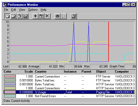 Figure 20.24 shows, in relative terms, the activity on your server at a glance. You can see very quickly the number of connections and other important parameters. If you observe the % Usage of the page file growing steadily, check the types of access being completed. If you have an ISAPI application running, the application might have a memory-management problem.