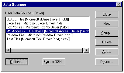 The process for creating an ODBC system data source for a Jet database is similar to that for SQL Server, but the Access 95 (7.0) ODBC driver presents a different dialog for specifying the database. To create an ODBC system database for Jet 3.0 tables, starting from the open Add Data Source dialog, follow these steps: