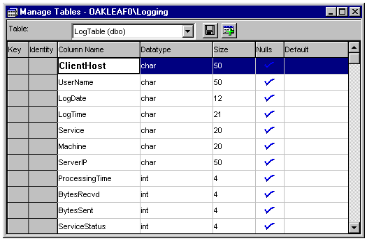 Internet Information Server 2.0 requires a logging table with a specific structure corresponding to the fields of the text version of the log described in Chapter 19, "Setting Up the Internet Information Server." A single logging file includes records for all IIS 2.0 services.