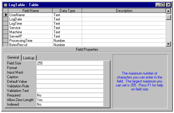 Using a Jet 3.0 table eliminates the need to license and administer SQL Server. To create a Jet 3.0 database with a LogTable table, follow these steps:
