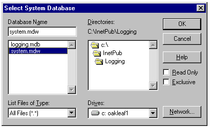 Specifying the Access system (workgroup) file in the Select System Database dialog.