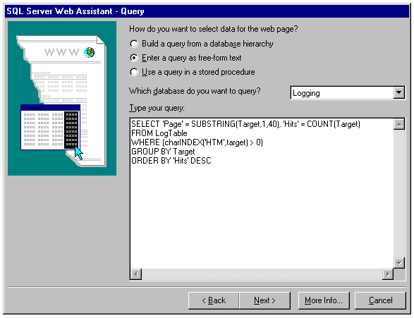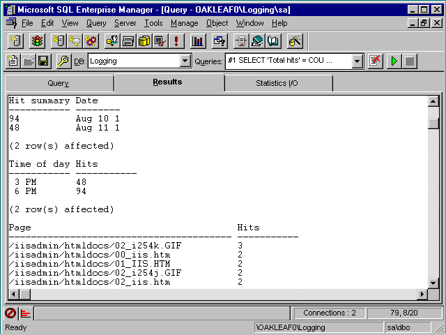 The sample SQL Server query of listing 20.2 returns summary information for hits against the server, and displays the relative popularity of Web pages. Figure 20.16 shows SQL Enterprise Manager displaying the result set returned by the last three queries of listing 20.2 against entries created by two brief testing sessions.