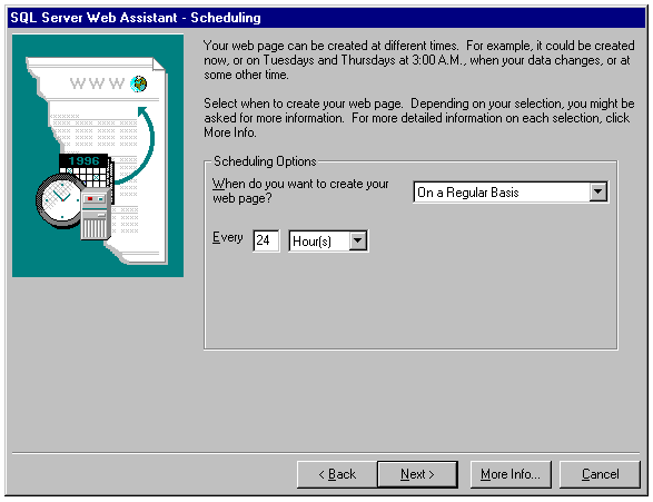 If you want to distribute usage information for your site, SQL Server 6.5's Web Assistant automates the process. The SQL Web Assistant automatically creates formatted Web pages that contain query result sets formatted as tables. A single page can display the result set from one or more queries. You also can specify the frequency at which the page is updated by a SQL Server 6.5 scheduled task. If you use a scheduled task, you can add a DELETE query after the SELECT queries to maintain records only for a specified period in the logging table. You must have system administrator privileges to use the Web Assistant.