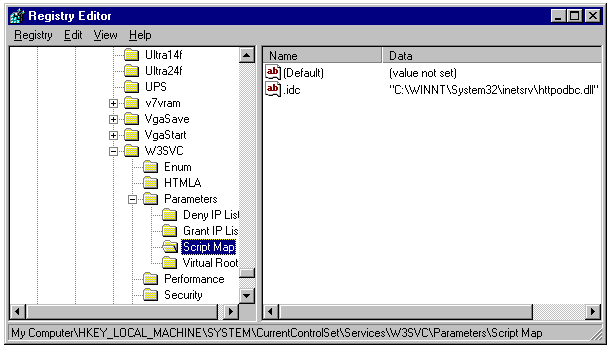 When IIS 2.0 loads an .IDC file, IIS examines the extension and determines the application used for the source file. One of the very powerful capabilities and features of IIS is its capability to use extension resolution to determine how to handle a given request. Files with a .GIF extension, for example, are graphic images, and files with an .IDC extension are IDC source files that associate with Httpodbc.dll. Associations for IIS 2.0's Web service are set up in the following Registry tree location: