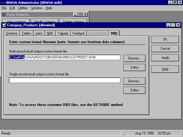 If you installed IIS 2.0 using the default Internet publishing directory, \InetPub, you must modify the DBX files that dbWeb uses to specify the location of its sample documents. Follow these steps to make the changes required to run the sample applications: