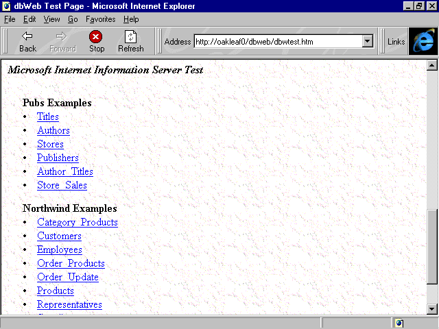 You access the dbWeb sample pages from a networked browser with the URL http://servername/dbweb/dbwtest.htm. Scroll down to the links to Pubs Examples and Northwind Examples to try the examples (see fig. 20.35). Figure 20.36 shows the page for the Northwind Category_Products data source displaying the first of four Categories table records and part of the Products table for the Beverages category. The Products list corresponds to an Access subform. The Category Listing page is static; no user-entered criteria is accepted.