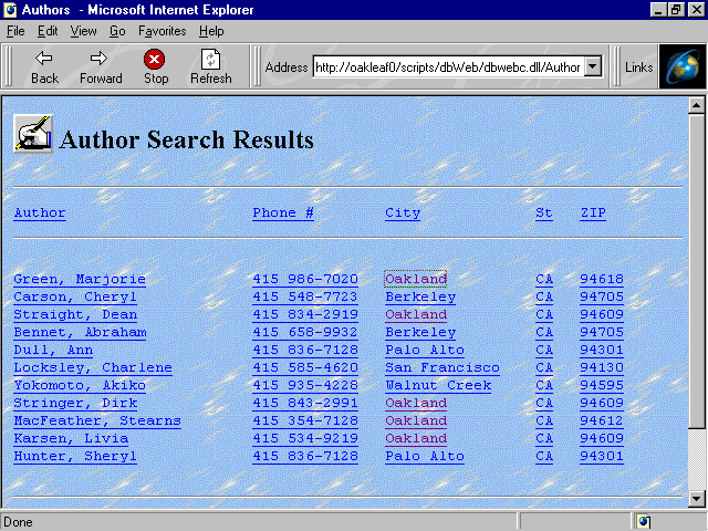 Figure 20.37 illustrates a more complex, dynamic query page for the pubs database. You enter query constraints in text boxes with modifiers chosen from standard drop-down lists. Figure 20.38 shows the result of the query of figure 20.37. (The pubs database hasn't been updated for the 510 area code of the San Francisco East Bay region.) If you click a City link, a list of all authors in the same city appear, illustrating the drill-down capabilities of dbWeb pages.