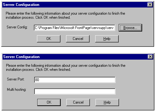 The Server Configuration dialogs for setting the location of the server configuration file (top) and the TCP/IP port number for IIS 2.0 (bottom).