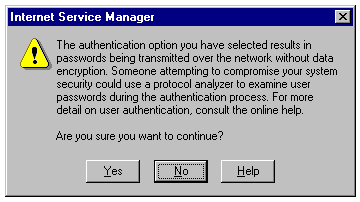 The message that explains that enabling the Basic (Clear Text) authentication option may compromise the security of password transmission.
