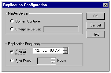 Establishing the master server and a replication frequency in the Replication Configuration dialog.