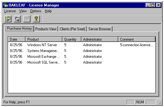 License Manager is Microsoft's aid to keeping you honest in the licensing department. Unlike some other network operating system and server application suppliers, Microsoft trusts its customers to purchase the required number of server Client Access Licenses for their organizations. License Manager lets you set the number of Client Access Licenses for BackOffice components operating in per-seat, not per-server, mode. Also, you can monitor and administer per-seat and per-server licenses for any server in the domain or in a trusting domain.