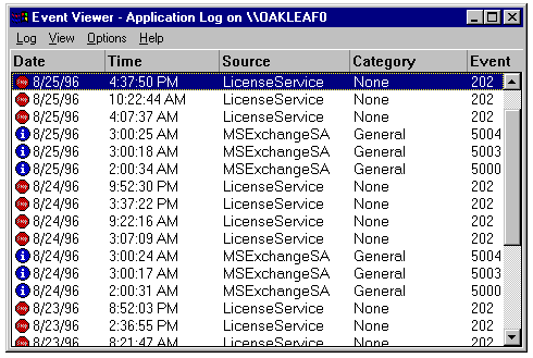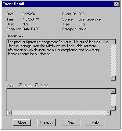 License violations appear as Stop events in Event Viewer's Application Log window (see fig. 21.14). Double-clicking the event item displays an Event Detail dialog (see fig. 21.15).