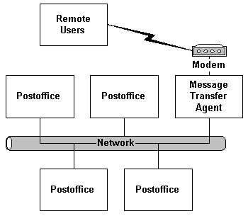 Postoffices not physically on the same network as the MTA call in to other postoffices to deliver and pick up mail. The MTA receives and processes the call, making available the messages that are pertinent to the calling postoffice. The MTA can be configured to receive calls and deliver any outgoing mail during the incoming call. The MTA also can be configured to place calls automatically, delivering mail to remote postoffices either on a scheduled basis or when the mail arrives at the MTA.