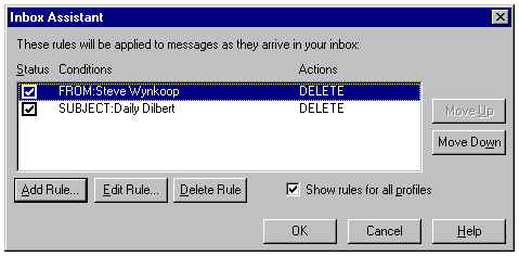 Setting up rules for incoming messages with the Exchange client's Inbox Assistant.