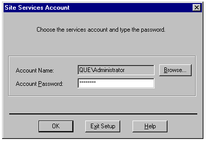 Specifying the Windows NT account (domain and user ID) and password for the Exchange Administrator account.