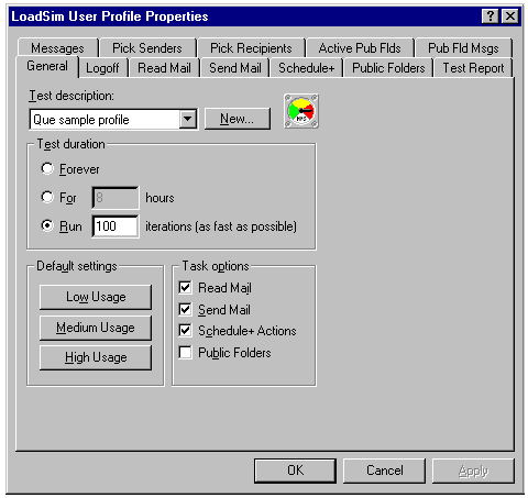 Setting the basic test user parameters in the LoadSim User Profile Properties sheet.