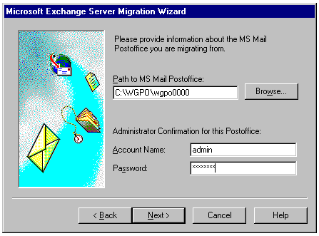 Specifying the MS Mail postoffice location and Administrator account name and password.