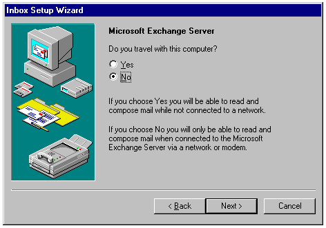 Choosing whether to add the inbox to Windows 95's StartUp program group.