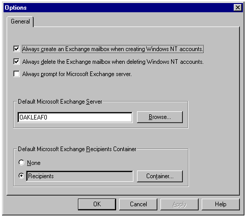 Specifying the recipient container for Exchange accounts and a template file for creating Windows NT accounts.