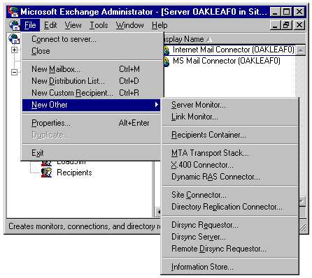 The Administrator is an effective tool for managing all Exchange objects. You can provide comprehensive distribution list management, user management, and connector support for your Exchange system. The specific options available depend on the services, transports, and connectors you install.