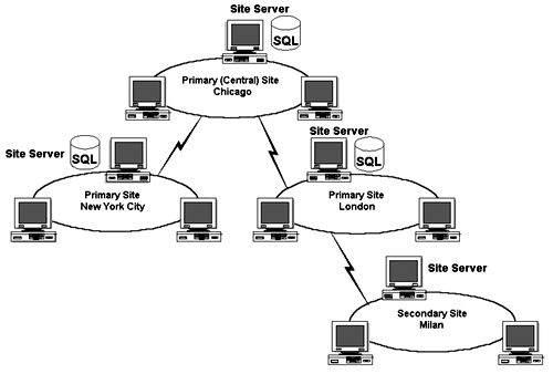 For the purposes of SMS, a site is a group of servers and clients in a LAN and/or WAN environment that typically are located in a single geographical area. In the example in figure 24.1, Chicago, New York City, London, and Milan are all sites.