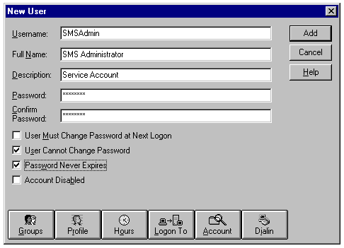 Before you install SMS on any Windows NT server, you must create the user account for the SMS service. You create this account, typically called SMSAdmin, with User Manager for Domains as follows: