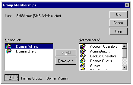 Adding the SMSAdmin account to the Domain Admins group.
