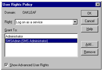 Adding the Log On as a Service right to the SMSAdmin account.