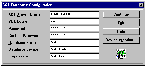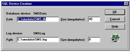 If you intend to run SQL Server and SMS on the same Windows NT Server, SMS creates the SQL devices and databases automatically. If you run SQL Server on a separate Windows NT Server, you must manually create the SMSData and SMSLog devices with SQL Enterprise manager. The default sizes of the SMSData and SMSLog devices are 45M and 8M, respectively.