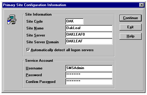 Specifying the configuration information for the Primary Site.